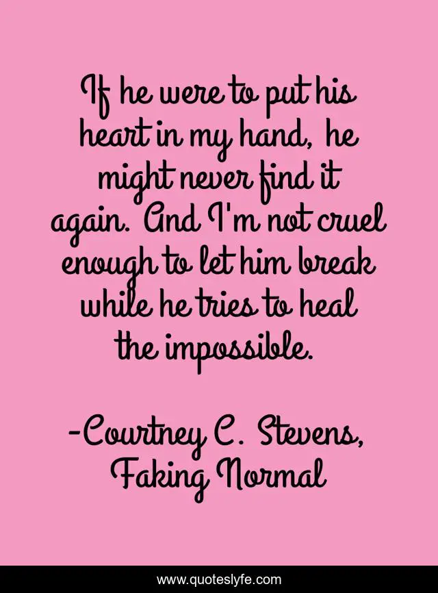 This page presents the quote "If he were to put his heart in my hand, he might never find it again. And I'm not cruel enough to let him break while he tries to heal the impossible.". Author of this quote is Courtney C. Stevens, Faking Normal. .