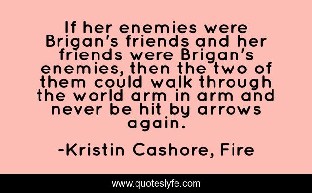 This page presents the quote "If her enemies were Brigan's friends and her friends were Brigan's enemies, then the two of them could walk through the world arm in arm and never be hit by arrows again.". Author of this quote is Kristin Cashore, Fire. This quote is about fire, thought, life,.