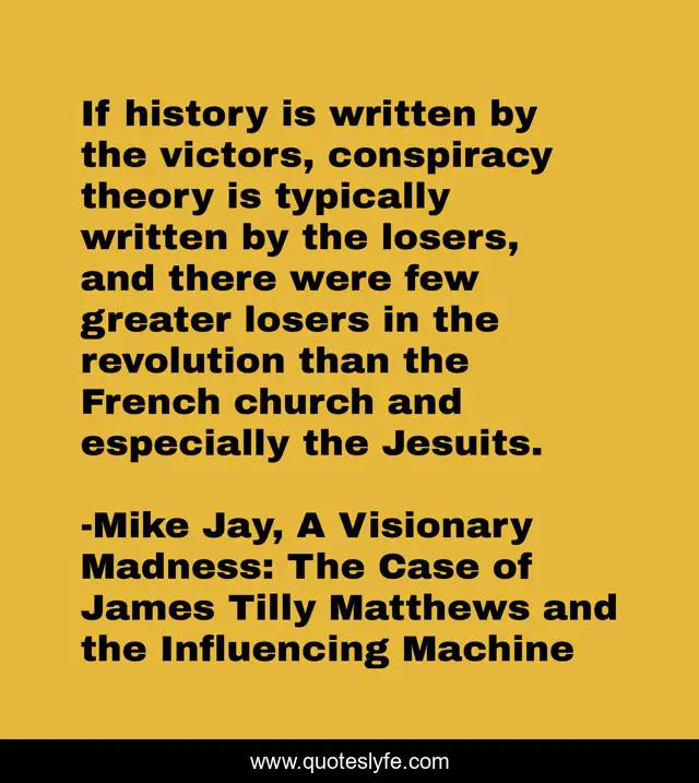 This page presents the quote "If history is written by the victors, conspiracy theory is typically written by the losers, and there were few greater losers in the revolution than the French church and especially the Jesuits.". Author of this quote is Mike Jay, A Visionary Madness: The Case of James Tilly Matthews and the Influencing Machine. This quote is about psychology, biography, history,.