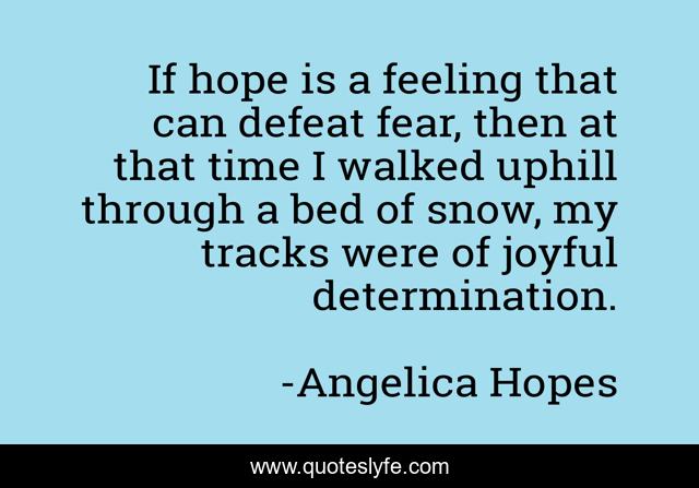 This page presents the quote "If hope is a feeling that can defeat fear, then at that time I walked uphill through a bed of snow, my tracks were of joyful determination.". Author of this quote is Angelica Hopes. This quote is about determination, snow, hope, winter,.