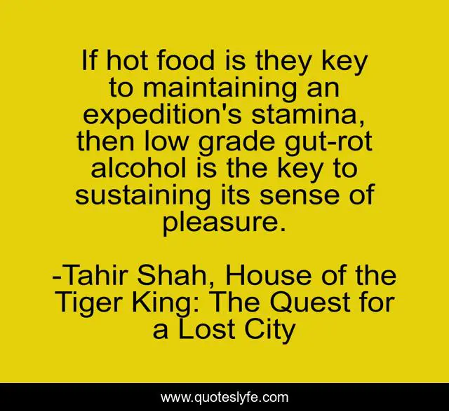 This page presents the quote "If hot food is they key to maintaining an expedition's stamina, then low grade gut-rot alcohol is the key to sustaining its sense of pleasure.". Author of this quote is Tahir Shah, House of the Tiger King: The Quest for a Lost City. This quote is about alcohol, expedition, food, sustenance, journey, adventure, pleasure,.