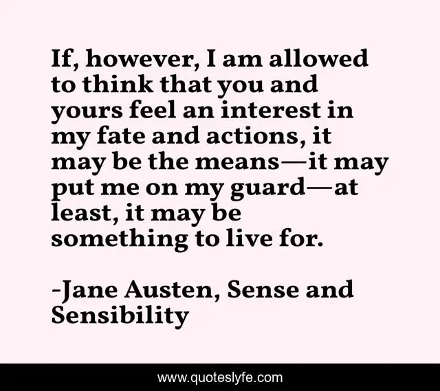 This page presents the quote "If, however, I am allowed to think that you and yours feel an interest in my fate and actions, it may be the means—it may put me on my guard—at least, it may be something to live for.". Author of this quote is Jane Austen, Sense and Sensibility. This quote is about depression, encouragement,.