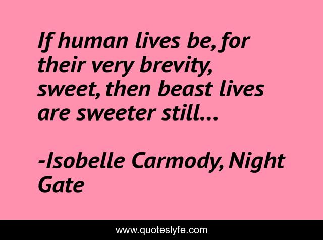 This page presents the quote "If human lives be, for their very brevity, sweet, then beast lives are sweeter still...". Author of this quote is Isobelle Carmody, Night Gate. This quote is about dogs-and-cats, cats, pets,.