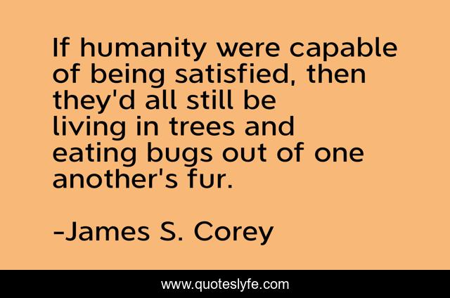 This page presents the quote "If humanity were capable of being satisfied, then they'd all still be living in trees and eating bugs out of one another's fur.". Author of this quote is James S. Corey. .