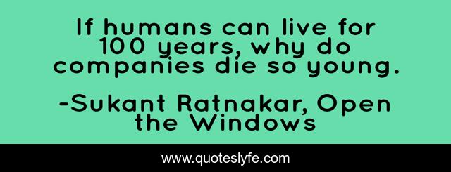 This page presents the quote "If humans can live for 100 years, why do companies die so young.". Author of this quote is Sukant Ratnakar, Open the Windows. This quote is about confidence, management, positive, motivational, optimistic, inspirational, innovation, enthusiasm,.