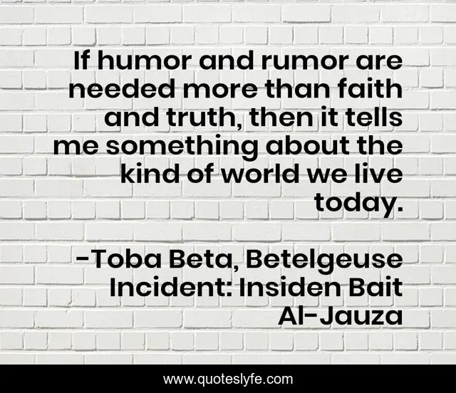 This page presents the quote "If humor and rumor are needed more than faith and truth, then it tells me something about the kind of world we live today.". Author of this quote is Toba Beta, Betelgeuse Incident: Insiden Bait Al-Jauza. This quote is about faith, kind, humor, life, secret, live, rumor, truth, world,.