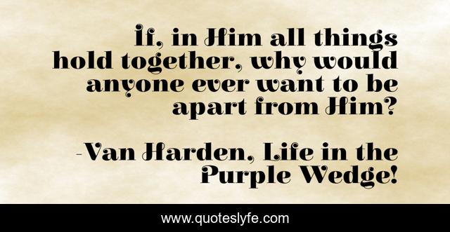 This page presents the quote "If, in Him all things hold together, why would anyone ever want to be apart from Him?". Author of this quote is Van Harden, Life in the Purple Wedge!. This quote is about jesus-christ, faith, christian-life, salvation,.