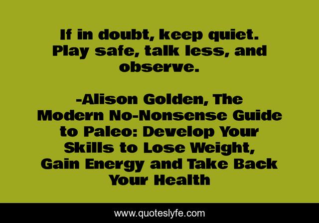 This page presents the quote "If in doubt, keep quiet. Play safe, talk less, and observe.". Author of this quote is Alison Golden, The Modern No-Nonsense Guide to Paleo: Develop Your Skills to Lose Weight, Gain Energy and Take Back Your Health. This quote is about paleo-diet, paleo, behavior, eating-habits,.
