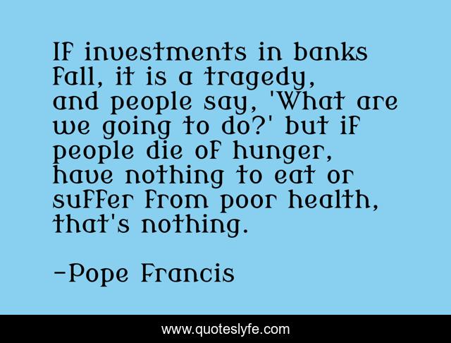 This page presents the quote "If investments in banks fall, it is a tragedy, and people say, 'What are we going to do?' but if people die of hunger, have nothing to eat or suffer from poor health, that's nothing.". Author of this quote is Pope Francis. This quote is about people, tragedy, fall,.