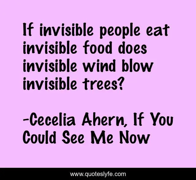 This page presents the quote "If invisible people eat invisible food does invisible wind blow invisible trees?". Author of this quote is Cecelia Ahern, If You Could See Me Now. This quote is about if-you-could-see-me-now, invisible, book, cecelia-ahernt,.