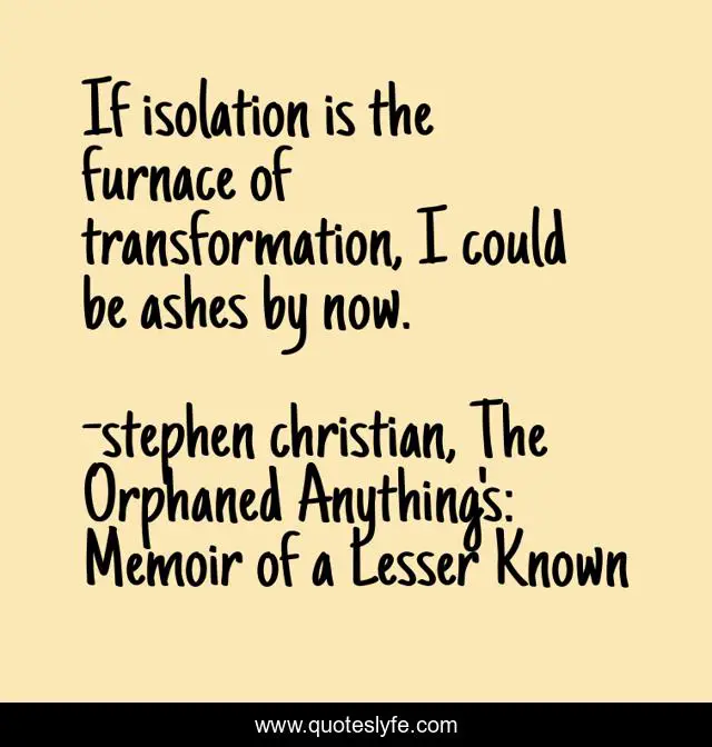 "stephen christian, The Orphaned Anything's: Memoir of a Lesser Known Quotes." Quoteslyfe.com, 2025. Fri. 05 Dec. 2025. <https://www.quoteslyfe.com/quote/If-isolation-is-the-furnace-of-transformation-222908>.