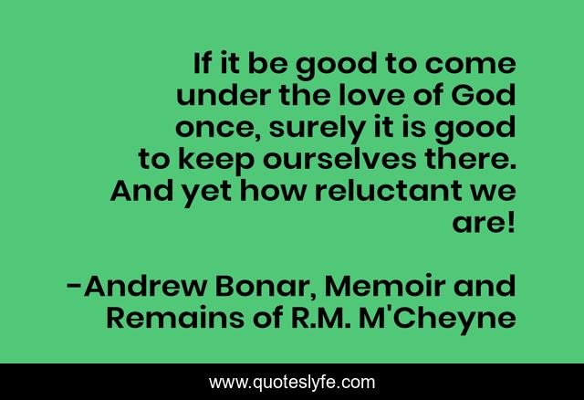This page presents the quote "If it be good to come under the love of God once, surely it is good to keep ourselves there. And yet how reluctant we are!". Author of this quote is Andrew Bonar, Memoir and Remains of R.M. M'Cheyne. This quote is about biography, christianity,.