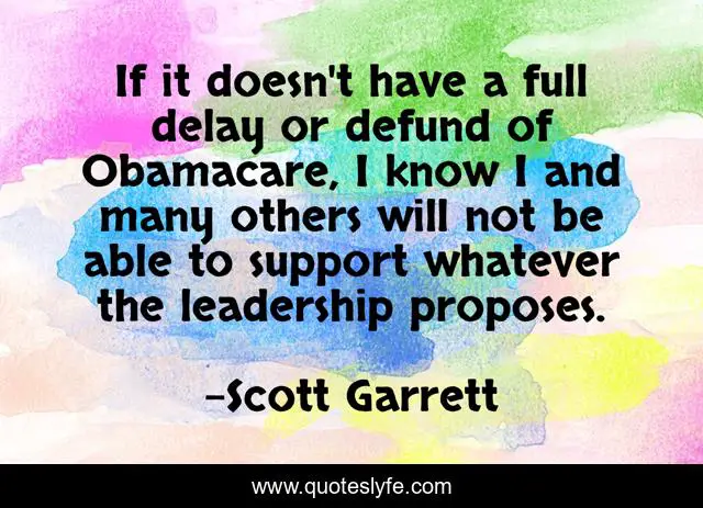 This page presents the quote "If it doesn't have a full delay or defund of Obamacare, I know I and many others will not be able to support whatever the leadership proposes.". Author of this quote is Scott Garrett. This quote is about delay, support,.