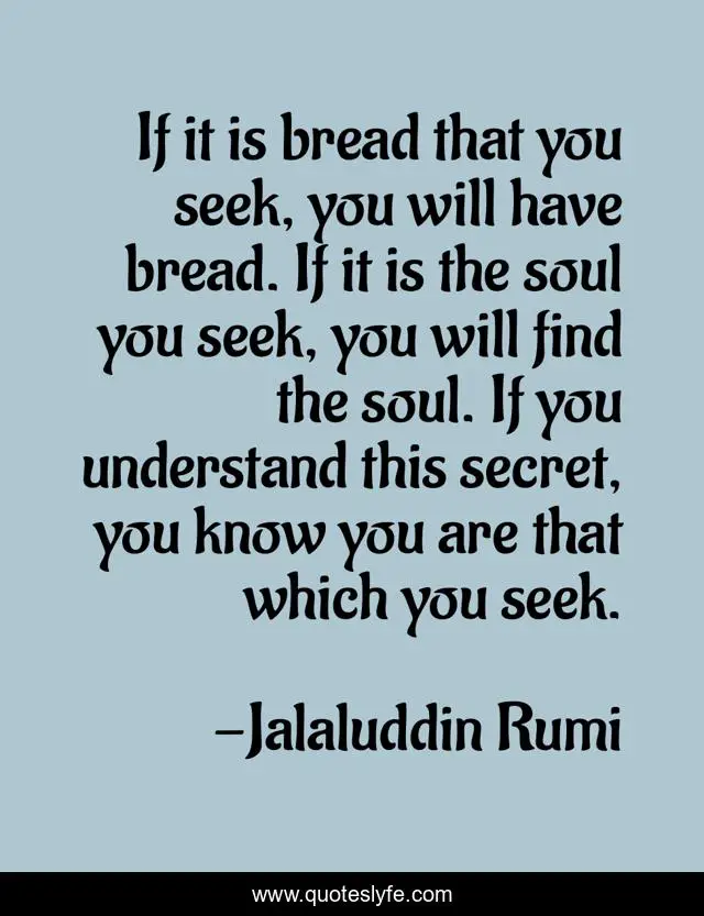 This page presents the quote "If it is bread that you seek, you will have bread. If it is the soul you seek, you will find the soul. If you understand this secret, you know you are that which you seek.". Author of this quote is Jalaluddin Rumi. This quote is about life, philosophy, self-awareness, positive, motivational, confidence, self-realization, optimistic, inspirational,.