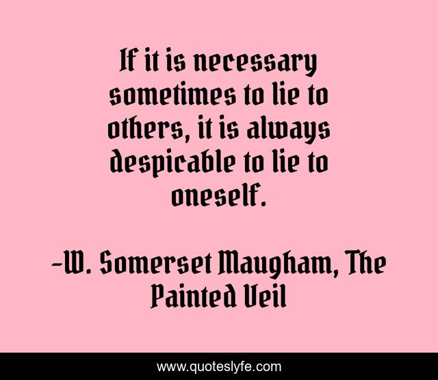 This page presents the quote "If it is necessary sometimes to lie to others, it is always despicable to lie to oneself.". Author of this quote is W. Somerset Maugham, The Painted Veil. This quote is about lies, lying, self-deception,.