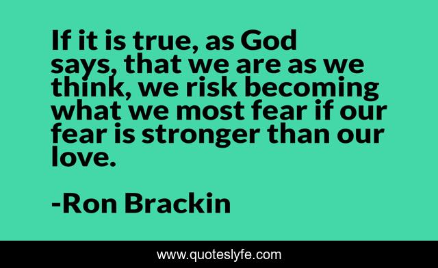 This page presents the quote "If it is true, as God says, that we are as we think, we risk becoming what we most fear if our fear is stronger than our love.". Author of this quote is Ron Brackin. This quote is about love, fear, self-image, identity, affection,.