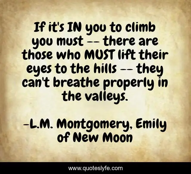 This page presents the quote "If it's IN you to climb you must -- there are those who MUST lift their eyes to the hills -- they can't breathe properly in the valleys.". Author of this quote is L.M. Montgomery, Emily of New Moon. .