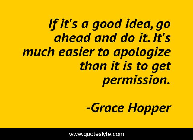 This page presents the quote "If it's a good idea, go ahead and do it. It's much easier to apologize than it is to get permission.". Author of this quote is Grace Hopper. This quote is about idea, ahead, apologize,.