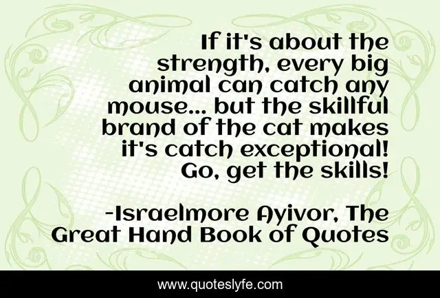 This page presents the quote "If it's about the strength, every big animal can catch any mouse... but the skillful brand of the cat makes it's catch exceptional! Go, get the skills!". Author of this quote is Israelmore Ayivor, The Great Hand Book of Quotes. This quote is about big-animal, be-skilled, strength, skillfulness, exceptional, skillful, big, brand, excellent,.