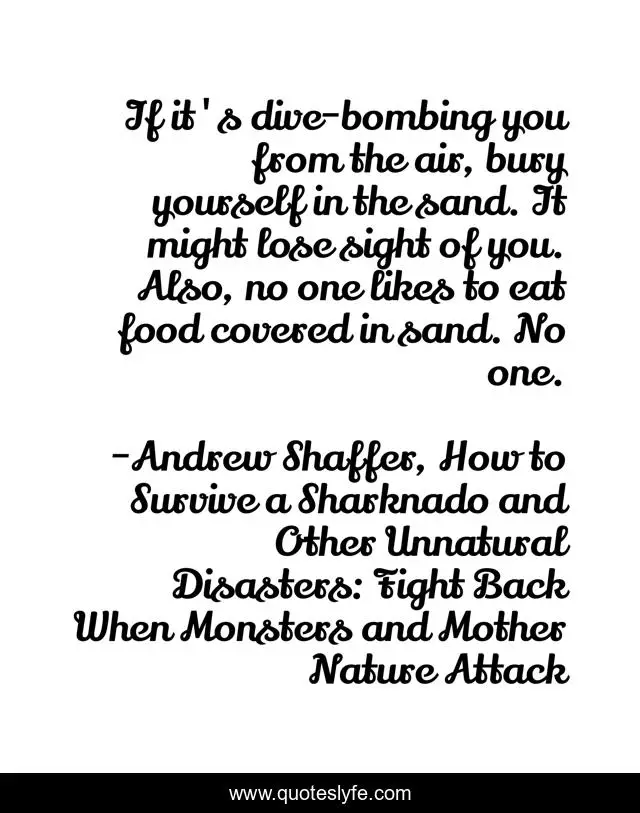 This page presents the quote "If it's dive-bombing you from the air, bury yourself in the sand. It might lose sight of you. Also, no one likes to eat food covered in sand. No one.". Author of this quote is Andrew Shaffer, How to Survive a Sharknado and Other Unnatural Disasters: Fight Back When Monsters and Mother Nature Attack. This quote is about food, sand, humor,.