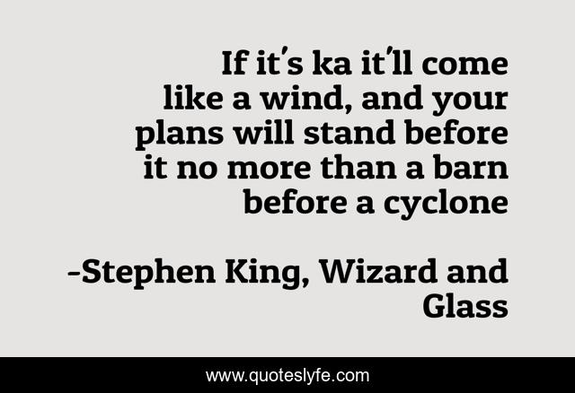 This page presents the quote "If it's ka it'll come like a wind, and your plans will stand before it no more than a barn before a cyclone". Author of this quote is Stephen King, Wizard and Glass. This quote is about wind, ka, love, fate, susan, susan-delgado, wizard-and-glass, stephen-king, cyclone,.