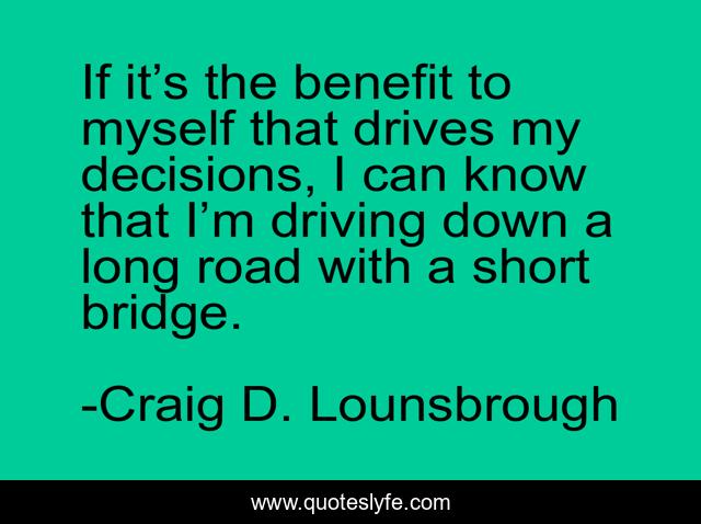 This page presents the quote "If it’s the benefit to myself that drives my decisions, I can know that I’m driving down a long road with a short bridge.". Author of this quote is Craig D. Lounsbrough. .