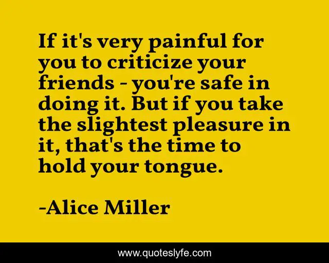 This page presents the quote "If it's very painful for you to criticize your friends - you're safe in doing it. But if you take the slightest pleasure in it, that's the time to hold your tongue.". Author of this quote is Alice Miller. This quote is about friends, time,.