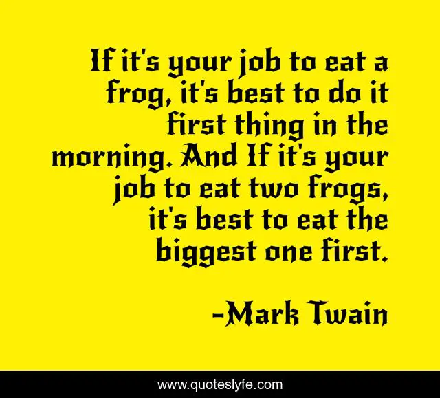 This page presents the quote "If it's your job to eat a frog, it's best to do it first thing in the morning. And If it's your job to eat two frogs, it's best to eat the biggest one first.". Author of this quote is Mark Twain. This quote is about job, best, first,.