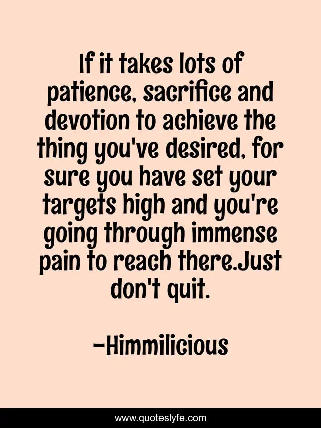 This page presents the quote "If it takes lots of patience, sacrifice and devotion to achieve the thing you've desired, for sure you have set your targets high and you're going through immense pain to reach there.Just don't quit.". Author of this quote is Himmilicious. This quote is about hardwork, achieving-success, success,.