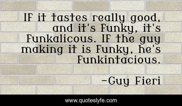 This page presents the quote "If it tastes really good, and it's funky, it's funkalicous. If the guy making it is funky, he's funkintacious.". Author of this quote is Guy Fieri. This quote is about funky, guy, tastes,.
