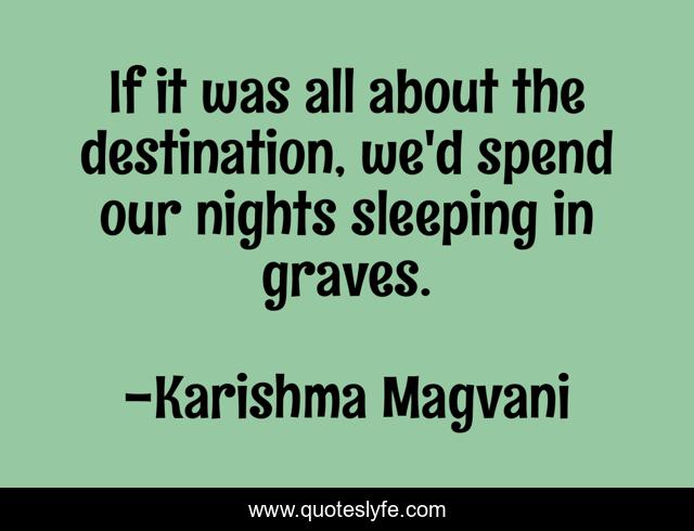 This page presents the quote "If it was all about the destination, we'd spend our nights sleeping in graves.". Author of this quote is Karishma Magvani. This quote is about death, life, journey, final-destination, journey-of-life,.