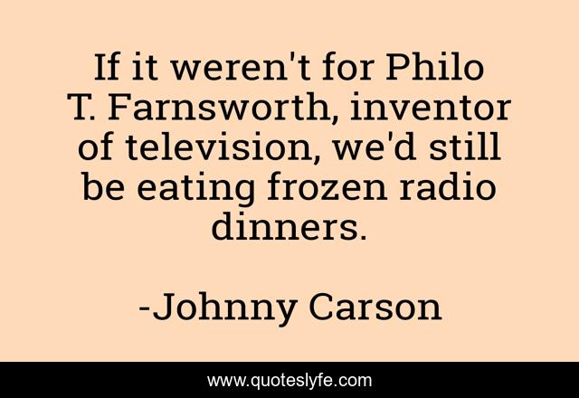 This page presents the quote "If it weren't for Philo T. Farnsworth, inventor of television, we'd still be eating frozen radio dinners.". Author of this quote is Johnny Carson. This quote is about eating, television, radio,.