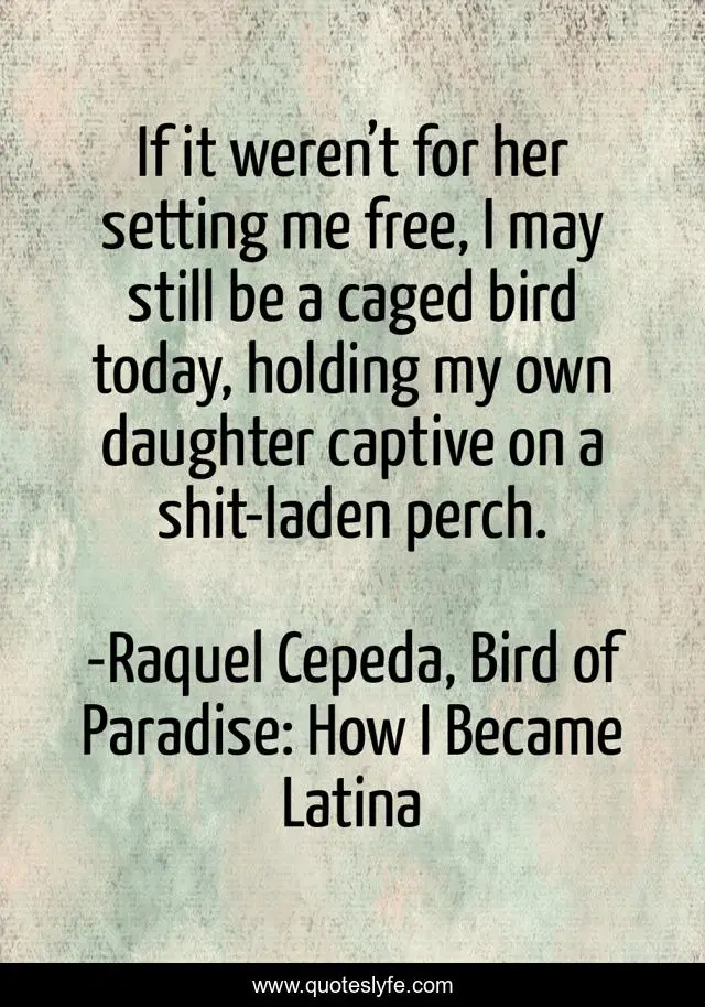 This page presents the quote "If it weren’t for her setting me free, I may still be a caged bird today, holding my own daughter captive on a shit-laden perch.". Author of this quote is Raquel Cepeda, Bird of Paradise: How I Became Latina. This quote is about mothers, freedom, breaking-free, motherhood, caged-bird, cycles, breaking-cycles,.