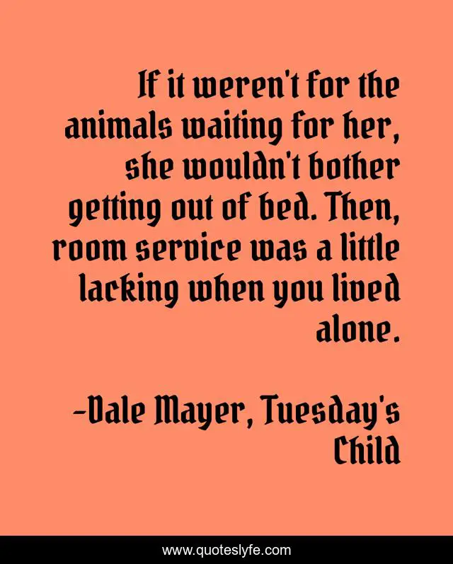This page presents the quote "If it weren't for the animals waiting for her, she wouldn't bother getting out of bed. Then, room service was a little lacking when you lived alone.". Author of this quote is Dale Mayer, Tuesday's Child. This quote is about psychic, animals, pets,.