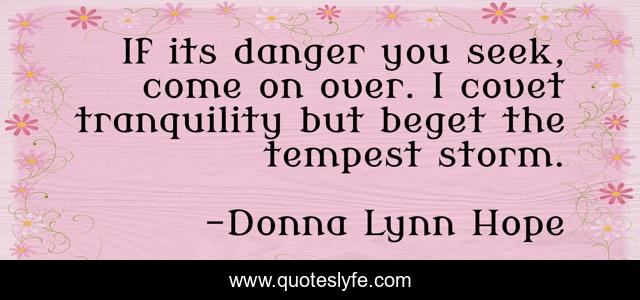 This page presents the quote "If its danger you seek, come on over. I covet tranquility but beget the tempest storm.". Author of this quote is Donna Lynn Hope. This quote is about femme-fatale, passion, danger,.
