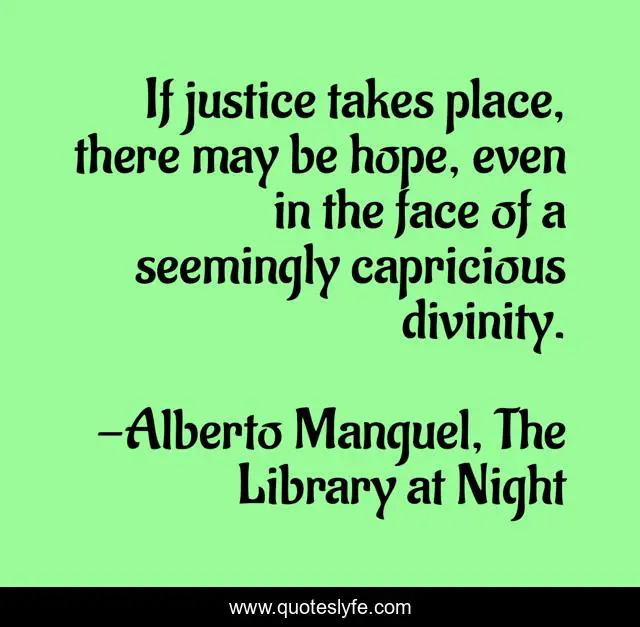 This page presents the quote "If justice takes place, there may be hope, even in the face of a seemingly capricious divinity.". Author of this quote is Alberto Manguel, The Library at Night. This quote is about justice, divinity, hope,.