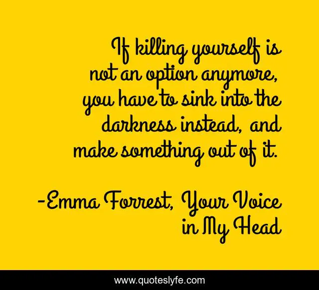 This page presents the quote "If killing yourself is not an option anymore, you have to sink into the darkness instead, and make something out of it.". Author of this quote is Emma Forrest, Your Voice in My Head. This quote is about suicide, depression,.