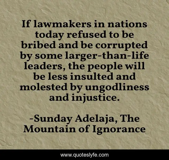 This page presents the quote "If lawmakers in nations today refused to be bribed and be corrupted by some larger-than-life leaders, the people will be less insulted and molested by ungodliness and injustice.". Author of this quote is Sunday Adelaja, The Mountain of Ignorance. This quote is about leaders, danger, lawmaking, mountain, darkness, god, people, insult, injustice,.