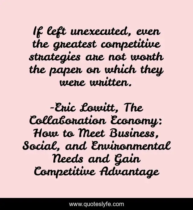 This page presents the quote "If left unexecuted, even the greatest competitive strategies are not worth the paper on which they were written.". Author of this quote is Eric Lowitt, The Collaboration Economy: How to Meet Business, Social, and Environmental Needs and Gain Competitive Advantage. This quote is about sustainability, business,.