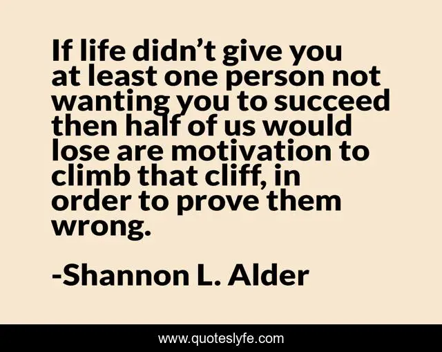 This page presents the quote "If life didn’t give you at least one person not wanting you to succeed then half of us would lose are motivation to climb that cliff, in order to prove them wrong.". Author of this quote is Shannon L. Alder. This quote is about life, plans, success, motivation, succeed, goals, dreams, never-give-up,.