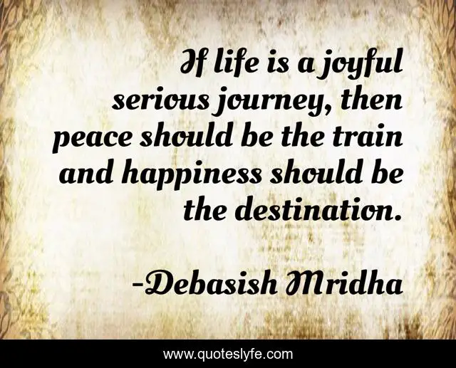 This page presents the quote "If life is a joyful serious journey, then peace should be the train and happiness should be the destination.". Author of this quote is Debasish Mridha. This quote is about peace, life-is-a-journey, mridha, philosophy, quotes, inspirational, enthusiasm, debasish-mridha-m-d, happiness,.
