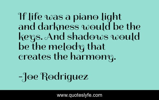 This page presents the quote "If life was a piano light and darkness would be the keys. And shadows would be the melody that creates the harmony.". Author of this quote is Joe Rodriguez. This quote is about shadows, darkness, light, music, inspirational, enthusiasm, melody, piano,.
