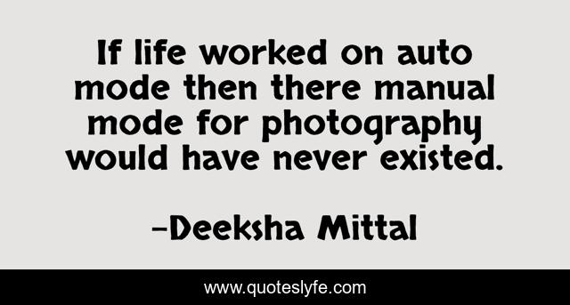 This page presents the quote "If life worked on auto mode then there manual mode for photography would have never existed.". Author of this quote is Deeksha Mittal. This quote is about life, digitalphotography, thinkers, dslr, photographer, photography, camera,.