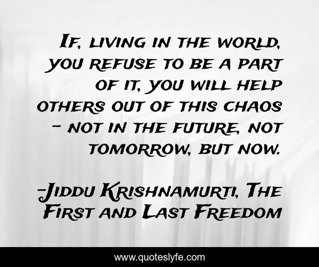 This page presents the quote "If, living in the world, you refuse to be a part of it, you will help others out of this chaos - not in the future, not tomorrow, but now.". Author of this quote is Jiddu Krishnamurti, The First and Last Freedom. This quote is about freedom, non-conformity, now, chaos,.