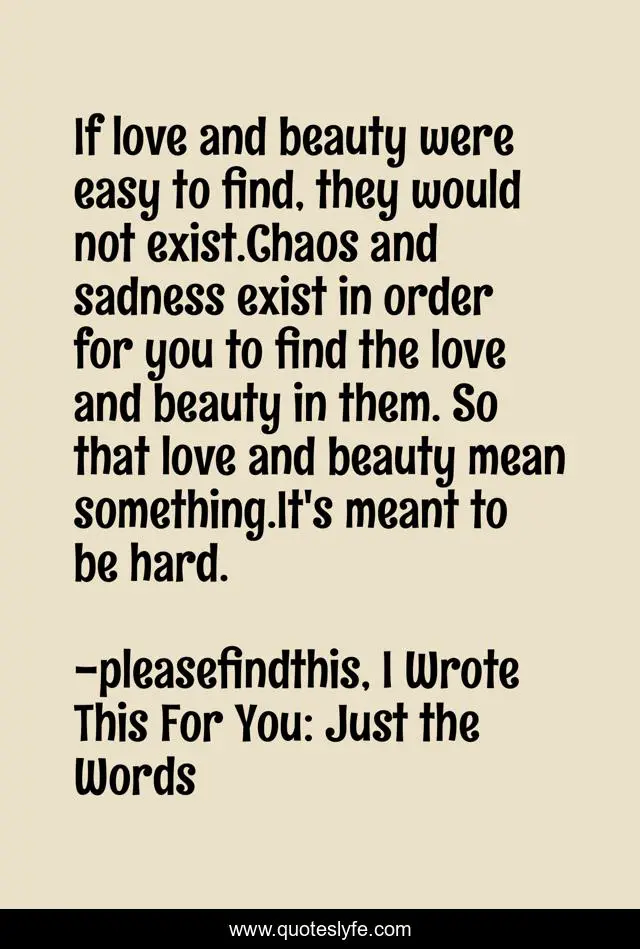 This page presents the quote "If love and beauty were easy to find, they would not exist.Chaos and sadness exist in order for you to find the love and beauty in them. So that love and beauty mean something.It's meant to be hard.". Author of this quote is pleasefindthis, I Wrote This For You: Just the Words. This quote is about poem, iwrotethisforyou, love, beauty, hard, chaos, poetry, difficulty, meaning,.
