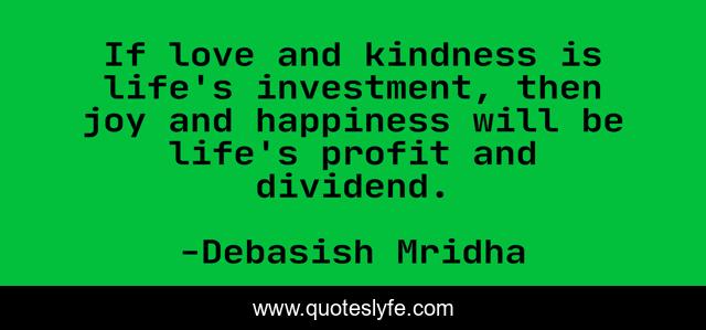 This page presents the quote "If love and kindness is life's investment, then joy and happiness will be life's profit and dividend.". Author of this quote is Debasish Mridha. This quote is about debasish, love, life-s-investment, divident, philosophy, debasish-mridha, life-s-profit, joy, kindness,.