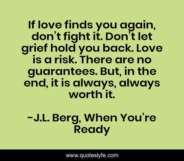 This page presents the quote "If love finds you again, don’t fight it. Don’t let grief hold you back. Love is a risk. There are no guarantees. But, in the end, it is always, always worth it.". Author of this quote is J.L. Berg, When You're Ready. This quote is about love, clare-logan, second-chance, risk, affection,.