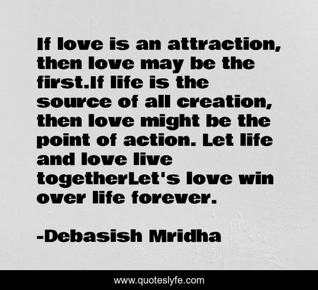 This page presents the quote "If love is an attraction, then love may be the first.If life is the source of all creation, then love might be the point of action. Let life and love live togetherLet's love win over life forever.". Author of this quote is Debasish Mridha. This quote is about life, love, knowledge, inspirational, intelligence, philosophy, wisdom, quotes, affection,.