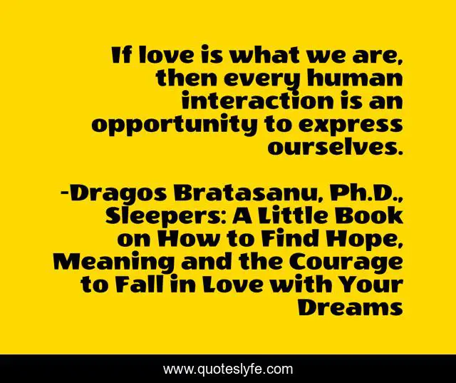 This page presents the quote "If love is what we are, then every human interaction is an opportunity to express ourselves.". Author of this quote is Dragos Bratasanu, Ph.D., Sleepers: A Little Book on How to Find Hope, Meaning and the Courage to Fall in Love with Your Dreams. This quote is about relationships, true-love, sharing, love, inspirational, enthusiasm, affection,.