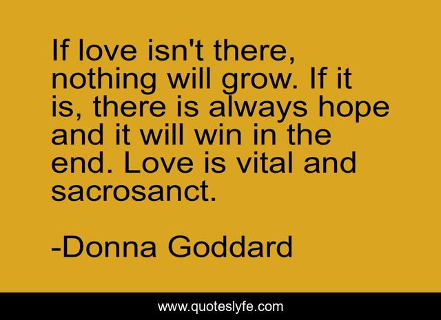 This page presents the quote "If love isn't there, nothing will grow. If it is, there is always hope and it will win in the end. Love is vital and sacrosanct.". Author of this quote is Donna Goddard. This quote is about relationships, relationships-love, spiritual, love, spiritual-wisdom, relationship, spiritual-growth, donna-goddard, spirituality,.
